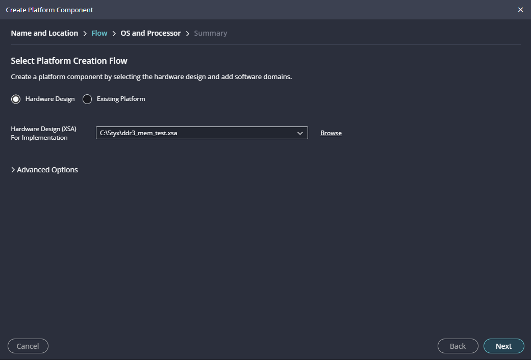 Launch Vitis IDE and create a new platform for the project, by selecting “Create Platform Component”, click “Next”, in the Flow tab select the XSA file saved using the step 14 and finally click “Next” and “Finish” respectively.