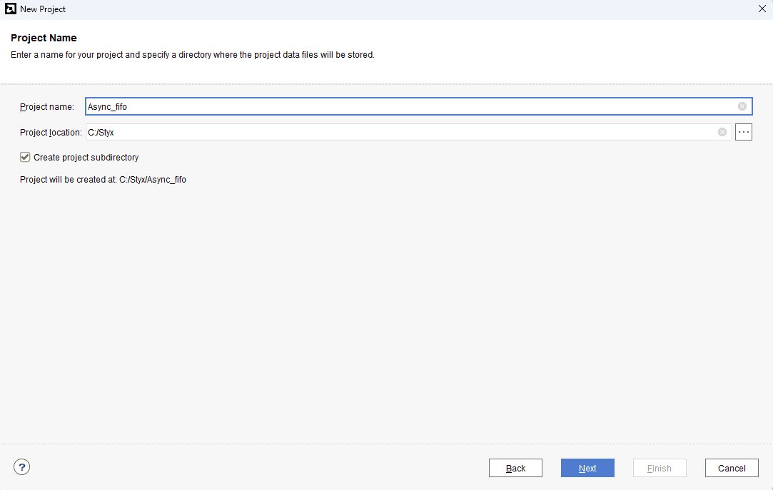Type in a project name and save it at a convenient location. For this example “Async_fifo” is used as project name, but feel free to use any name. Select the check box below to keep all project files in a single folder. The image below shows the settings for the example project. Click “Next” to continue.