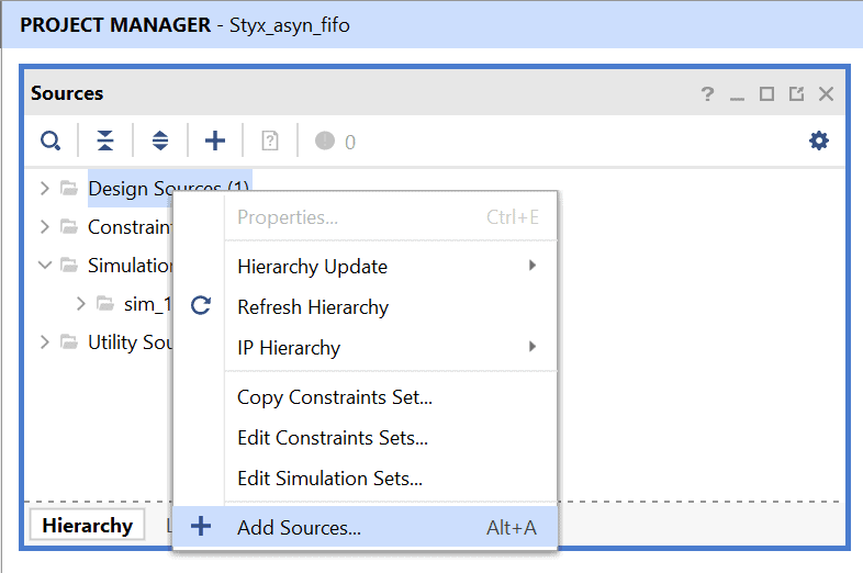 Right-Click on ‘Design Sources’ and select ‘Add Sources’. It will open a configuration window for adding Verilog files.