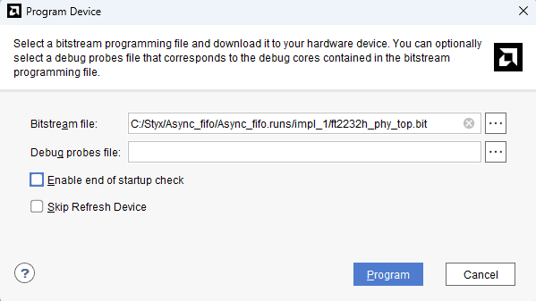Dialog window for programming will open. Program the bit file by clicking ‘Program’.