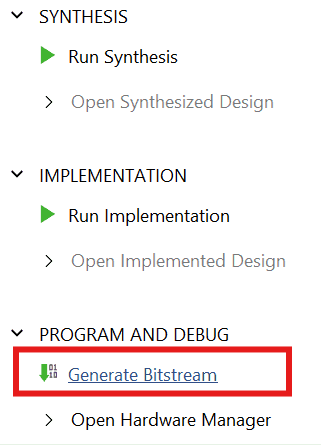 Click “Generate Bitstream” under PROGRAM AND DEBUG section and click “Yes” in any subsequent dialog window which comes up.