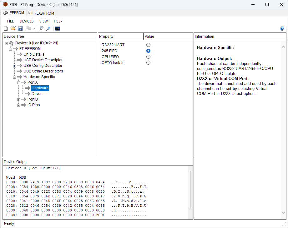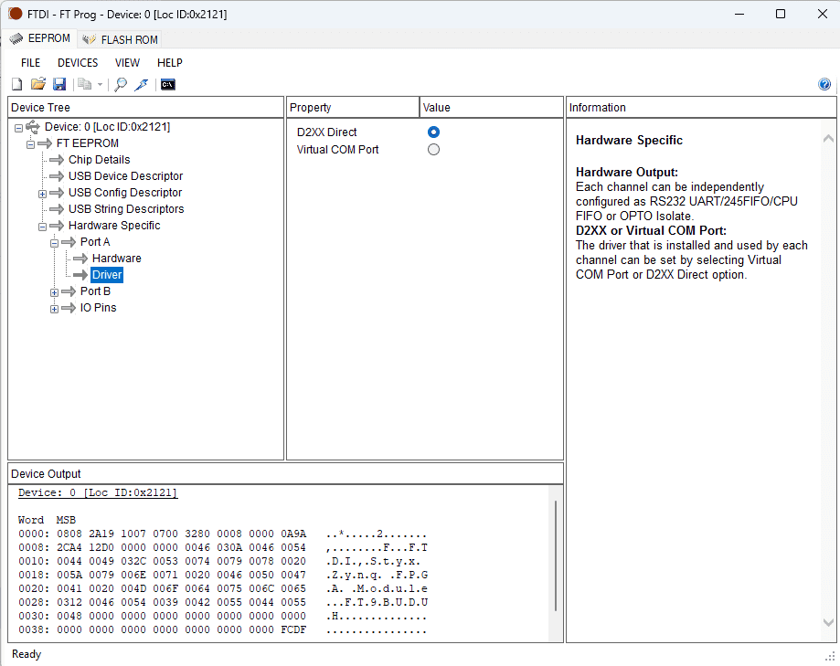 Now go to Hardware Specific -> Port A -> Driver and select D2XX Direct.