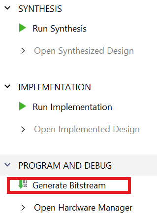 Click “Generate Bitstream” under PROGRAM AND DEBUG section and click “Yes” in any subsequent dialog window which comes up.