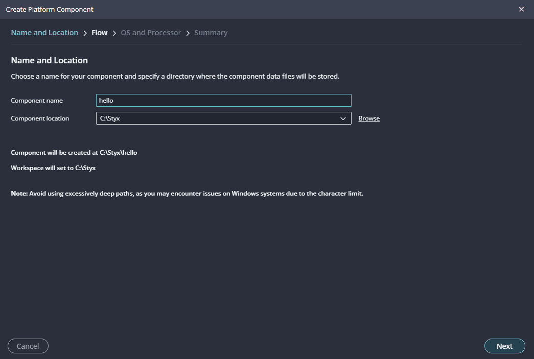 Give the component name and the platform location and click on “Next”.