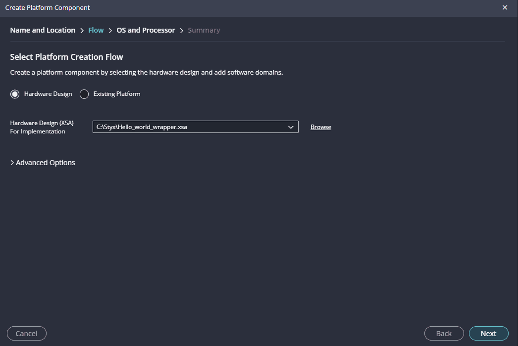 In the next tab browse the XSA file , select it , click on “Next”. In the next OS and Processor tab click “Next” and “Finish”.