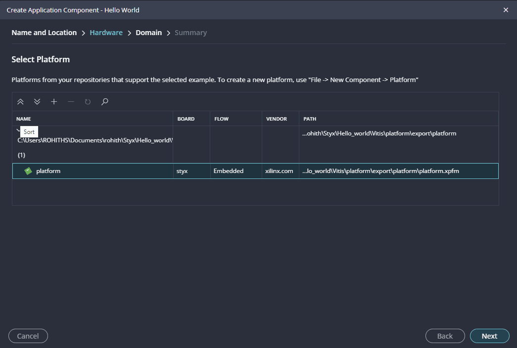 Launch Vitis IDE and create a new platform for the project, by selecting “Create Platform Component”, click “Next”, in the Flow tab select the XSA file saved using the step 14 and finally click “Next” and “Finish” respectively.