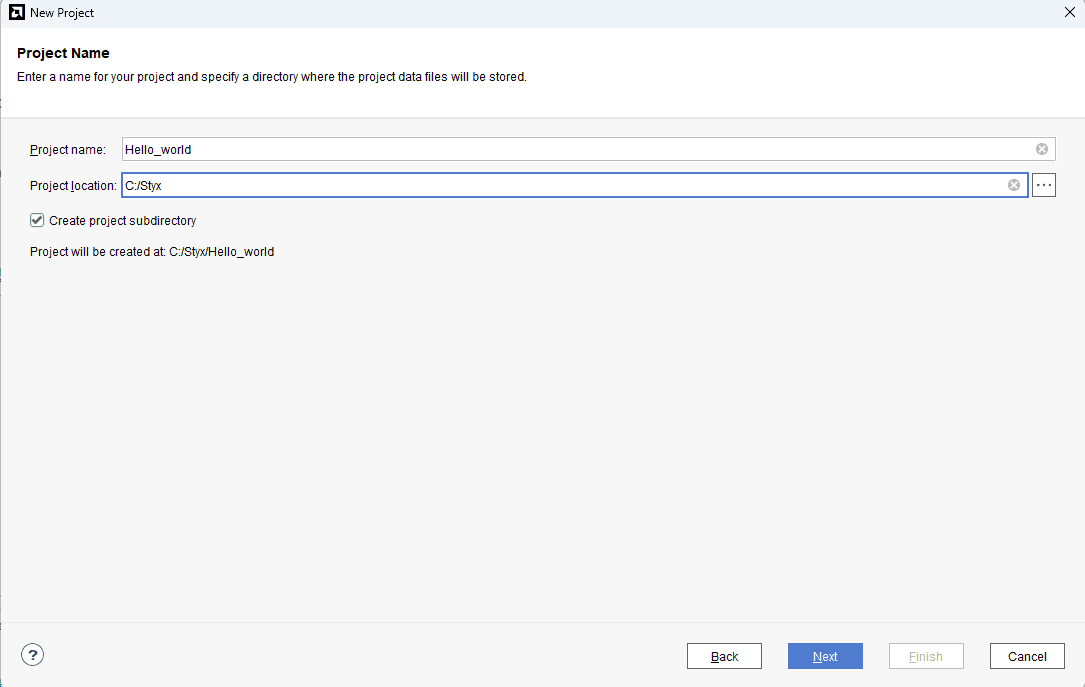 Type in a project name and save it at a convenient location. For this example “Hello_world” is used as project name, but feel free to use any name. Select the check box below to keep all project files in a single folder. The image below shows the settings for the example project. Click “Next” to continue.