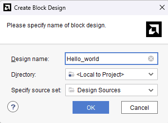 Under Flow Navigator, select “Create Block Design” in IP Integrator. Give an appropriate name to design. We will call it “Hello_world” for example.