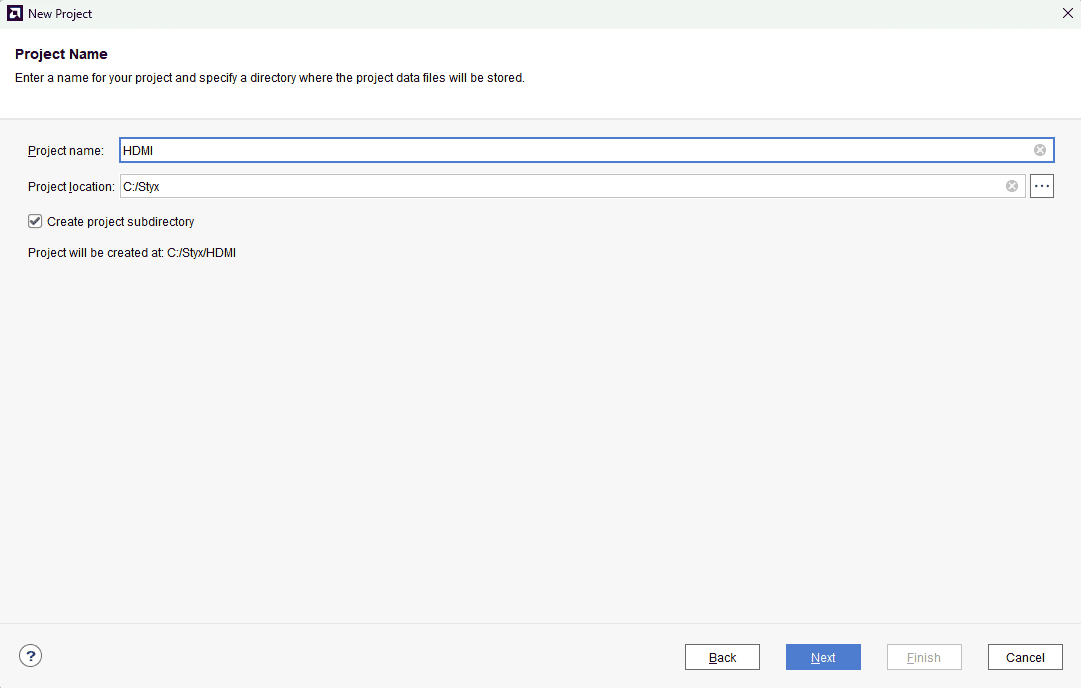 Type in a project name and save it at a convenient location. For this example “HDMI” is used as project name, but feel free to use any name. Select the check box below to keep all project files in a single folder. The image below shows the settings for the example project. Click “Next” to continue.