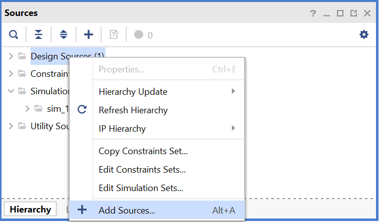 Right-Click on ‘Design Sources’ and select ‘Add Sources’. It will open a configuration window for adding Verilog files.