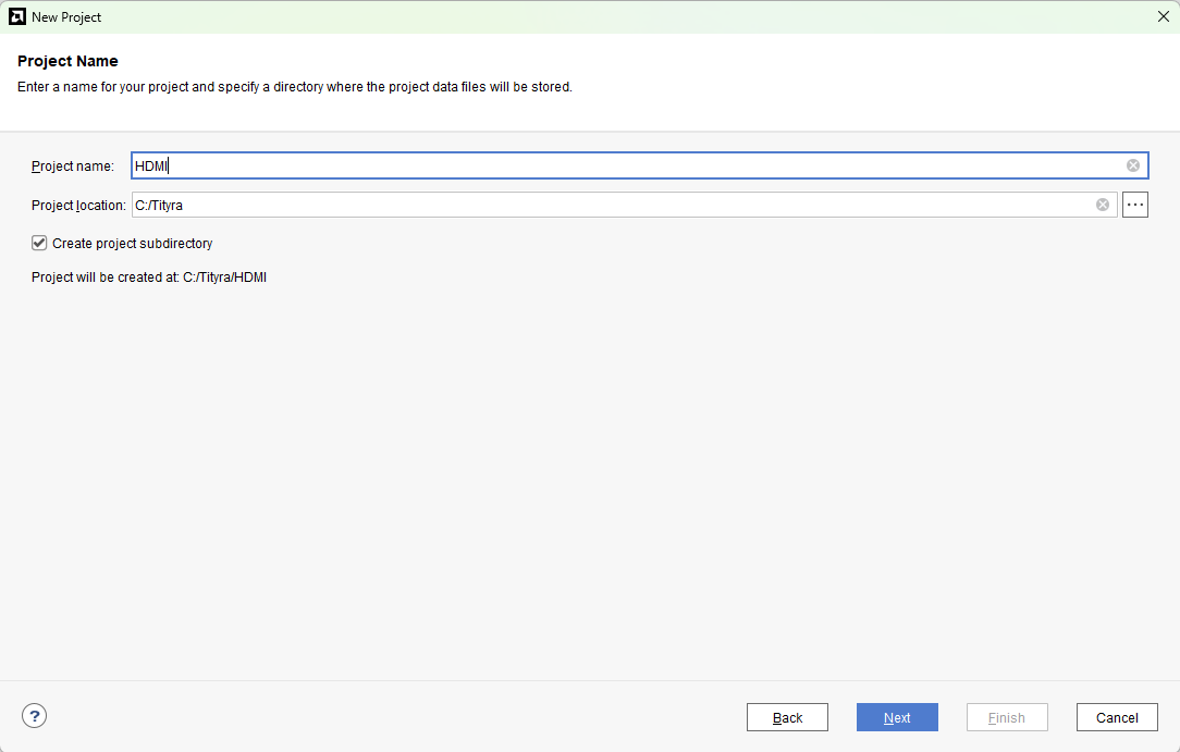 Type in a project name and save it at a convenient location. For this example “HDMI” is used as project name, but feel free to use any name. Select the check box below to keep all project files in a single folder. The image below shows the settings for the example project. Click “Next” to continue.