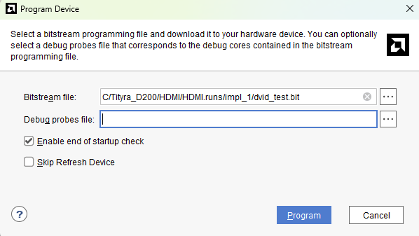 Select the TityraCore HDMI out bitstream and click “Program”.