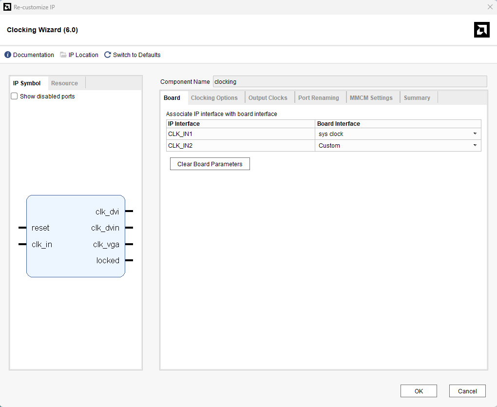 In “Board” section set the CLK_IN1 as “sys clock” and give component name as “Clocking”.