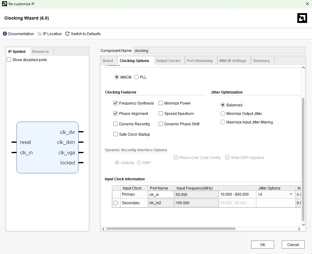 In “Clocking Options” tab, give Component Name as “clocking” and primary clock port name as “clk_in” and set the input Frequency of “clk_in” as “50MHz” .