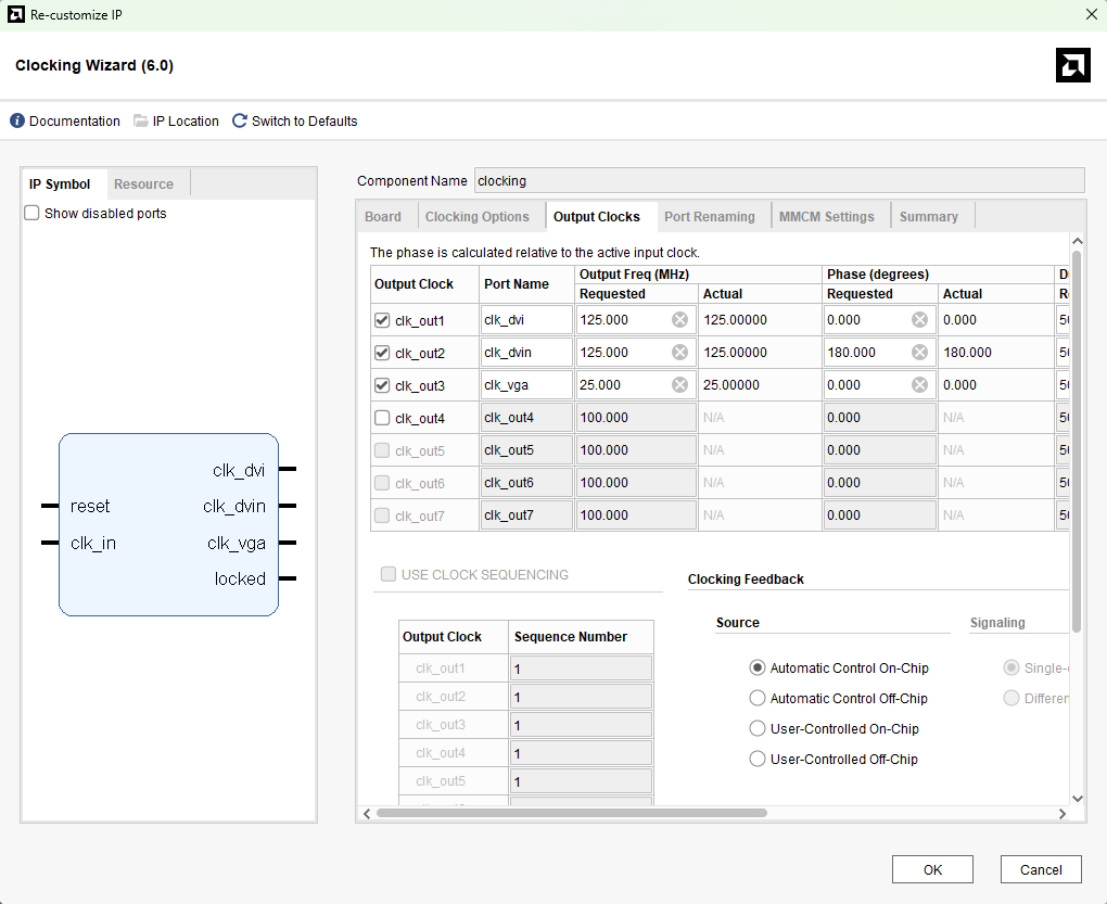 clocking : This module generates required clocks for VGA and DVI-D. The 100MHz clock from the on board oscillator is an input and this input clock drive the other three clocks from it.In this module clk_in (100MHz) is the input clock and the clk_dvi (125MHz), clk_dvin (125MHz), clk_vga (25MHz) are the output clocks for VGA and DVI-D. clk_dvin is 180 degrees out of phase to clk_dvi. These clocks are used for serialization using ODDR2. This module is also having Active High reset signal.
