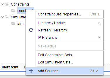 Go to “Add Sources” under the Flow Navigator -> PROJECT MANAGER window, select the “Add or create constraints” and click “Next”. Click on “Create file” and give a name for the XDC and select “File type” as “XDC”. Click “OK” and “Finish”.