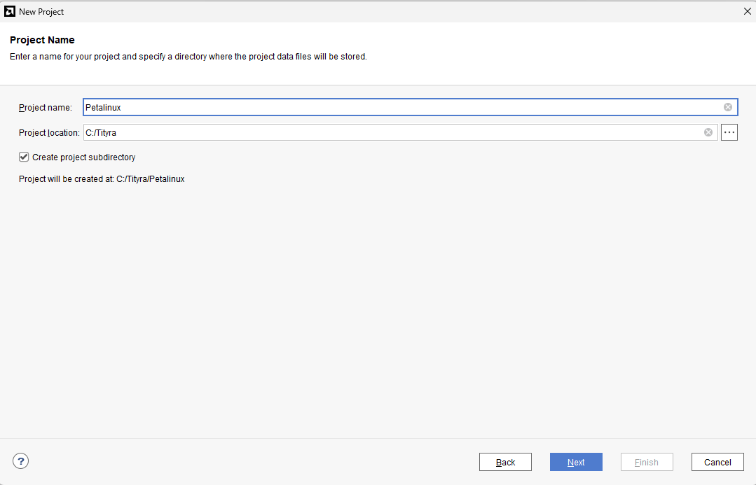 Type in a project name and save it in a convenient location. For this example “petalinux” is used as project name, but feel free to use any name. Select the check box below to keep all project files in a single folder. The image below shows the settings for the example project. Click “Next” to continue.