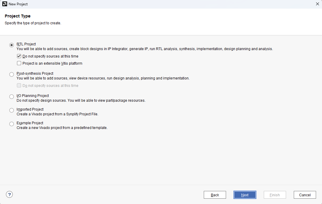 Choose “RTL Project” as project type and check the option “Do not specify sources at this time”.
