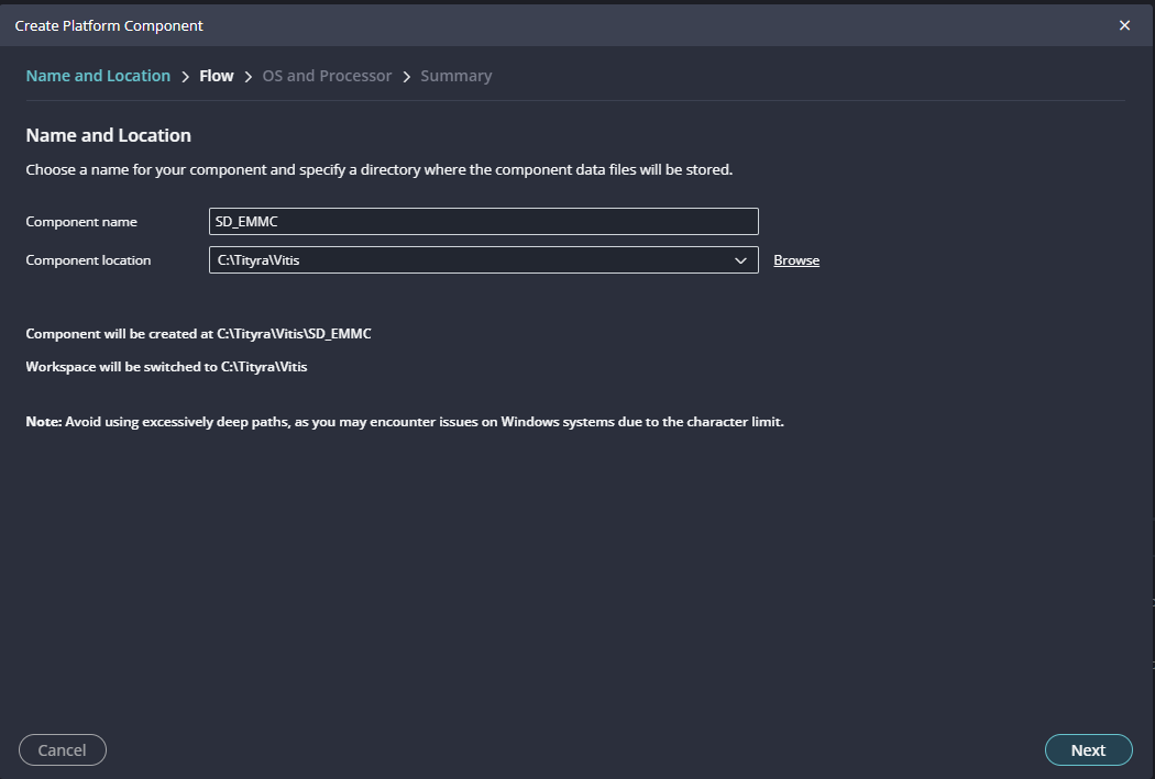Launch Vitis IDE and create a new platform for the project, by selecting “Create Platform Component”, click “Next”, in the Flow tab select the XSA file saved using the step 15 and finally click “Next” and “Finish” respectively.