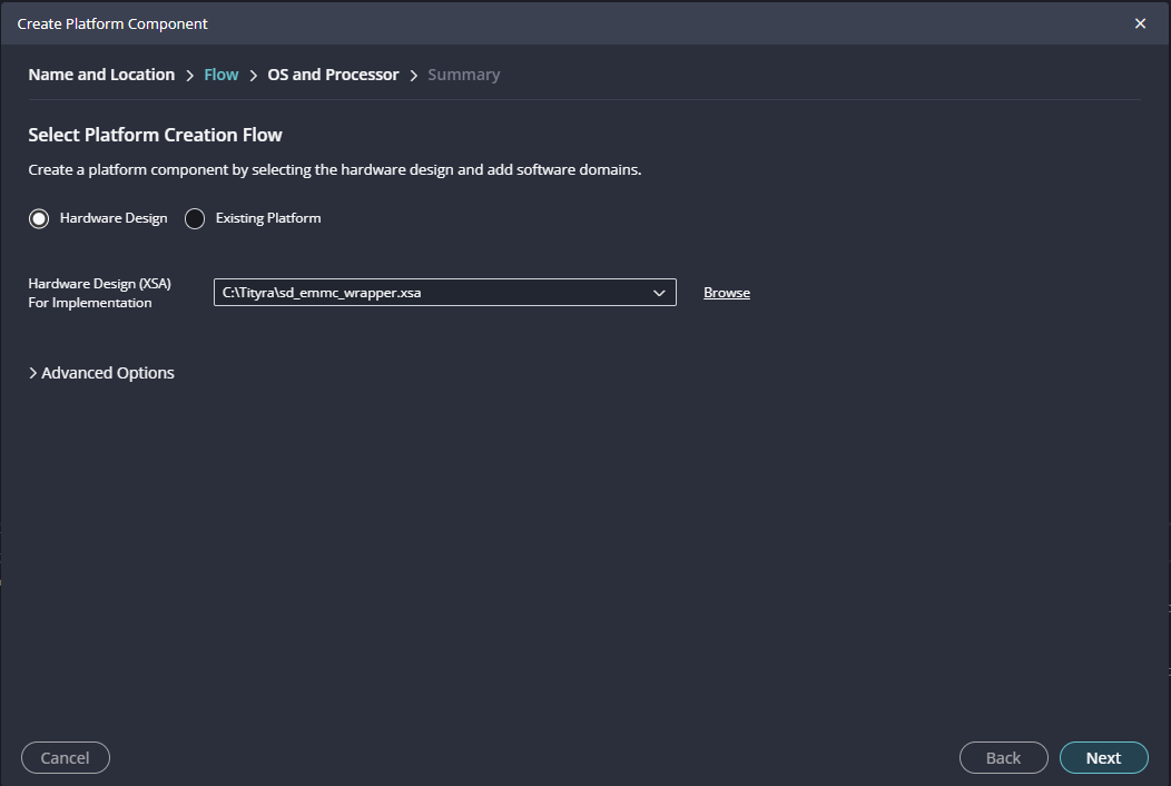 In the next tab browse the XSA file , select it , click on “Next”. In the next OS and Processor tab click “Next” and “Finish”.