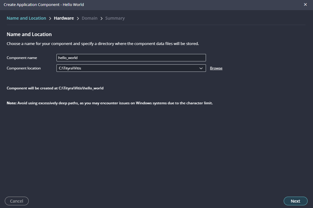 In “Create Application Component” tab specify project name and location, click “Next”.