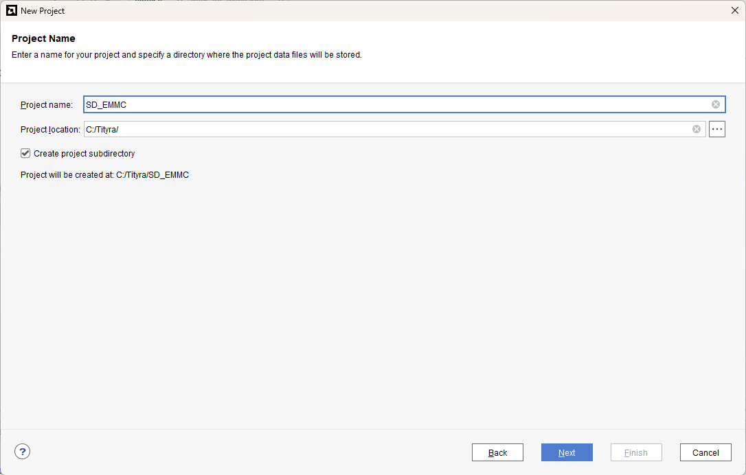 Type in a project name and save it at a convenient location. For this example “SD_EMMC” is used as project name, but feel free to use any name. Select the check box below to keep all project files in a single folder. The image below shows the settings for the example project. Click “Next” to continue.