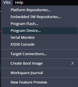 Program the FPGA on TityraCore D200 by selecting the Program Device option from the Vitis menu.