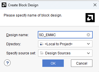 Under Flow Navigator, select “Create Block Design” in IP Integrator. Give an appropriate name to design. We will call it “SD_EMMC” for example.