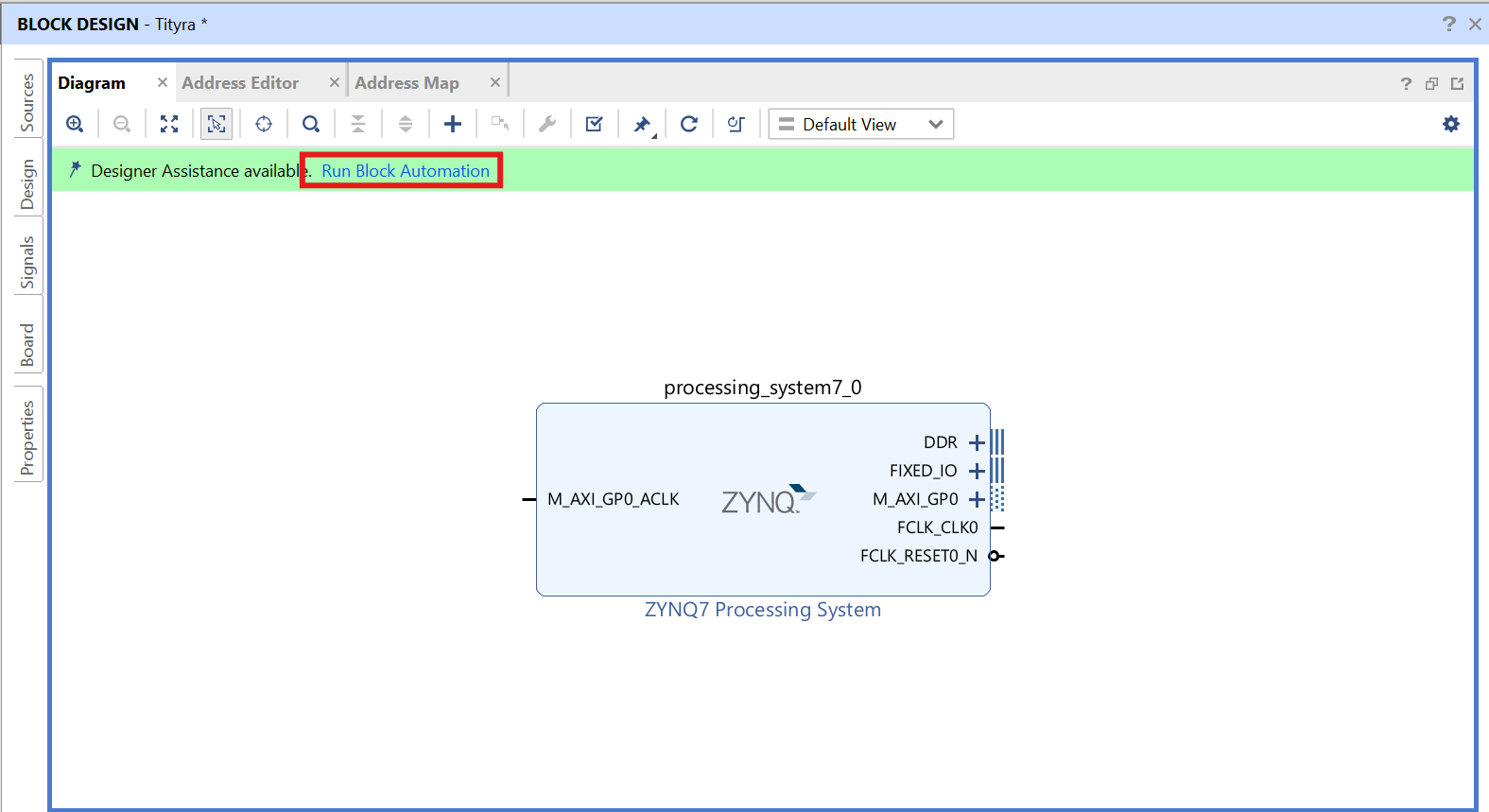 Go to Diagram window, right click and select “Add IP” from the popup menu. Search for ZYNQ7 Processing System. Add it to block design by double clicking.