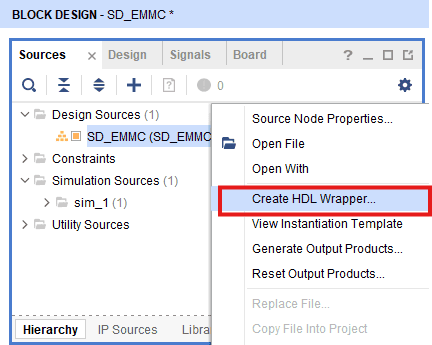 Go to “Sources” tab, right click on “SD_EMMC” design file and select “Create HDL Wrapper”. Click OK on the window that appears to finish generating wrapper.