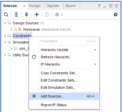 Go to âSourcesâ tab, right click on âWebserverâ design file and select âCreate HDL Wrapperâ. Click OK on the window that appears to finish generating wrapper.