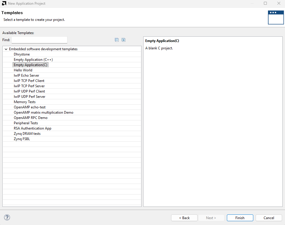 Select the Empty Application(C) template from the list of available templates and click Finish.