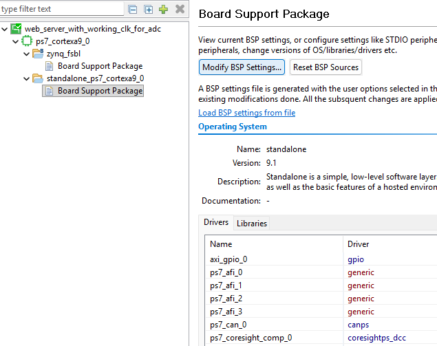 In the platform editor window select the Board support package editor then open the Modify BSP Settings.