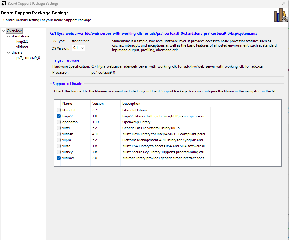 Select the lwip220 and xiltimer library and click ok to apply the changes, then the lwip and xiltimer library will be added to the platform project.