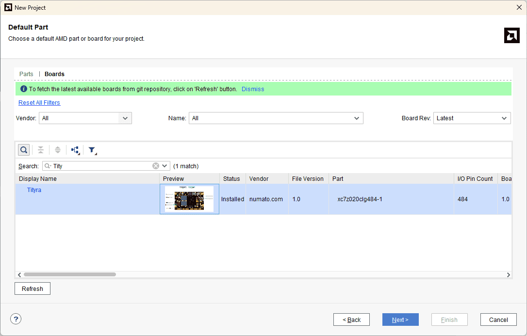 At the âDefault Partâ stage, switch to the âBoardsâ tab and set the vendor to numato.com. Select âTityraâ and click Next.If the Tityra board does not appear in the list, click âRefreshâ to update the board catalog. Vivado will then download the latest board files, after which Tityra will become available for selection.