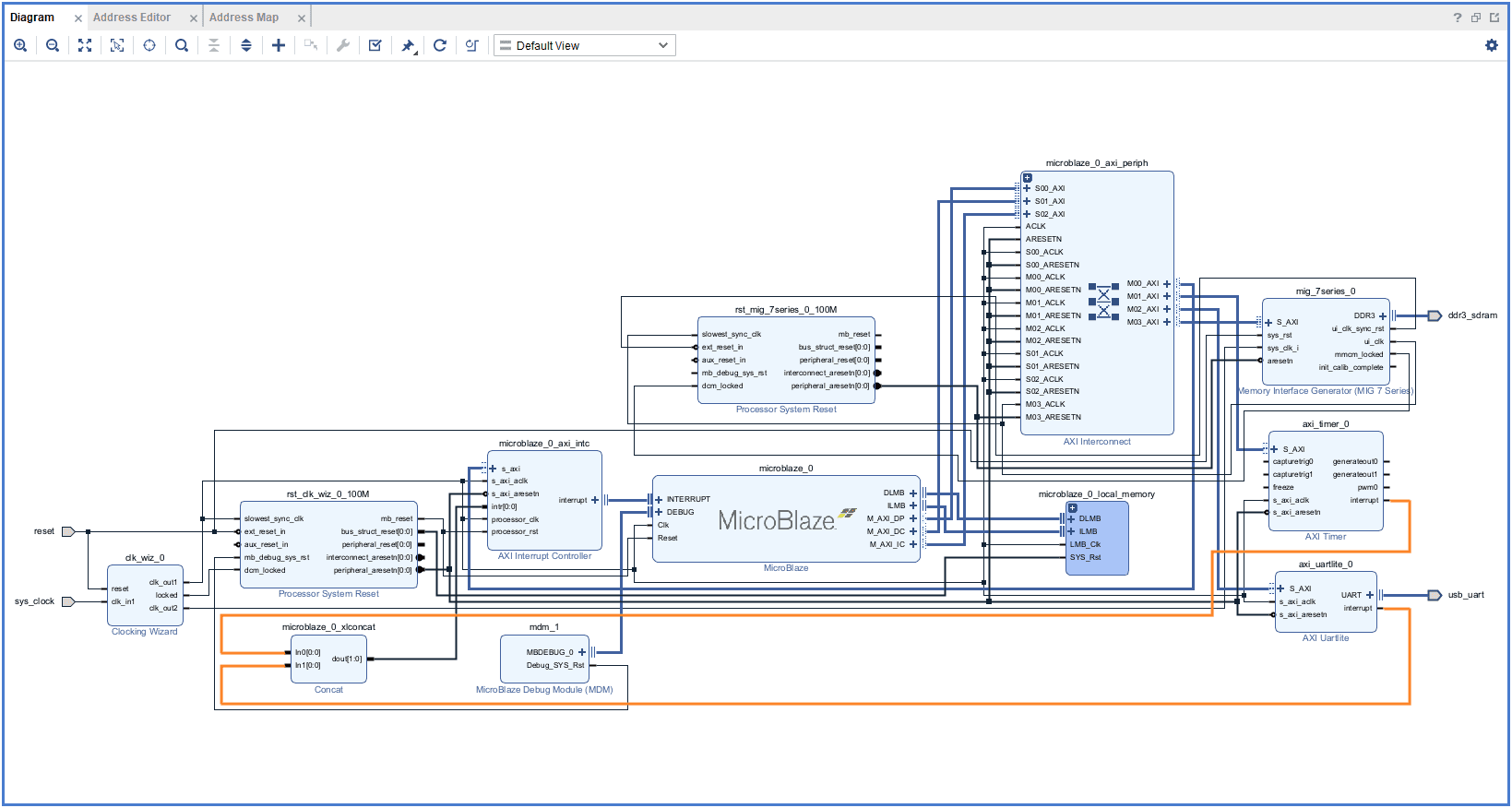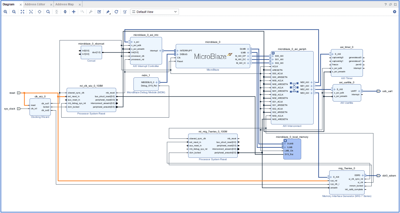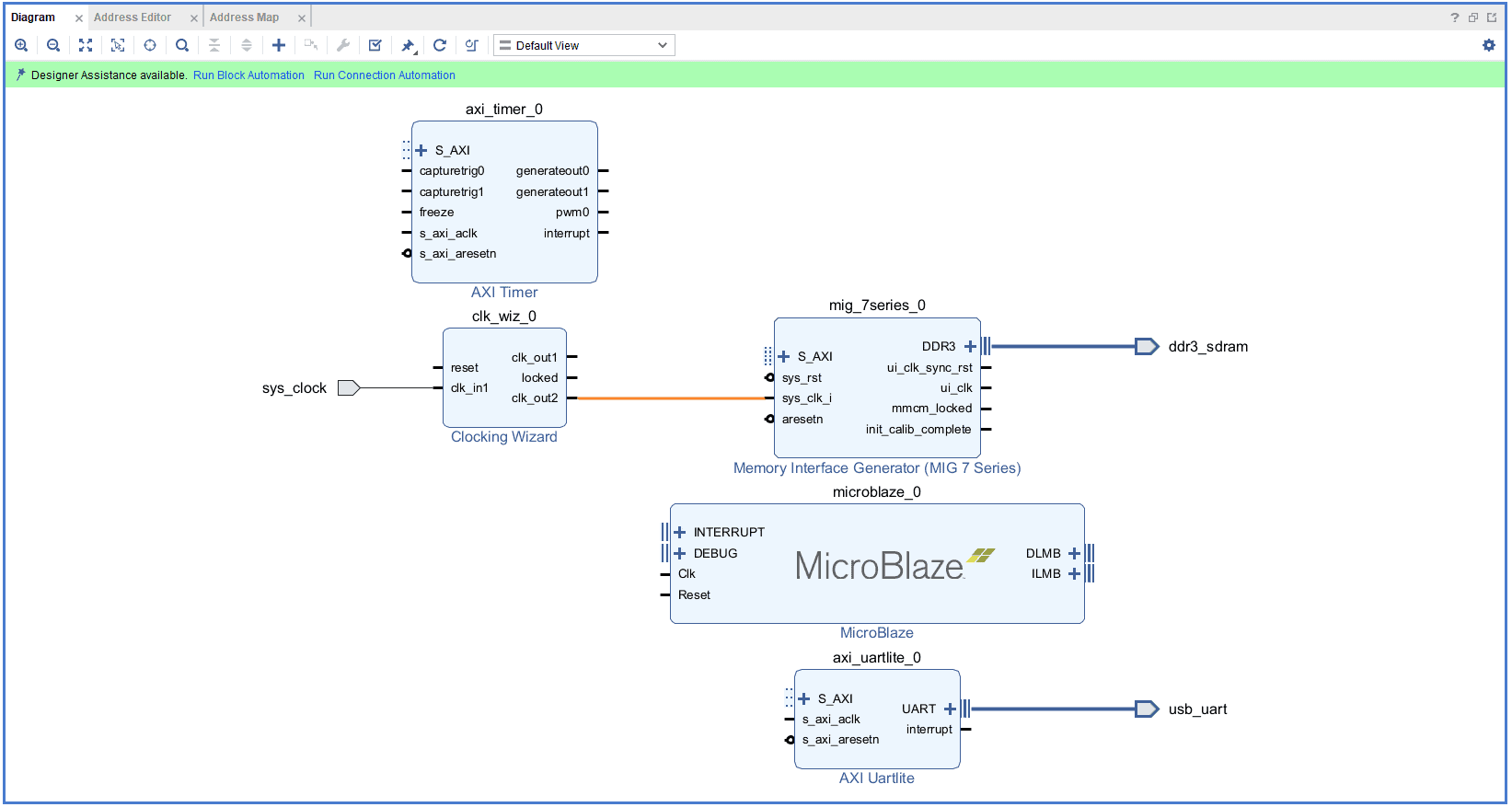 Add “System Clock“, “DDR3 SDRAM” and “USB UART” to the design by double-clicking the corresponding peripherals. In the “Diagram” window, right-click and select “Add IP” from the popup menu. Search for “MicroBlaze” & “AXI Timer” and add them to the design by double-clicking them.