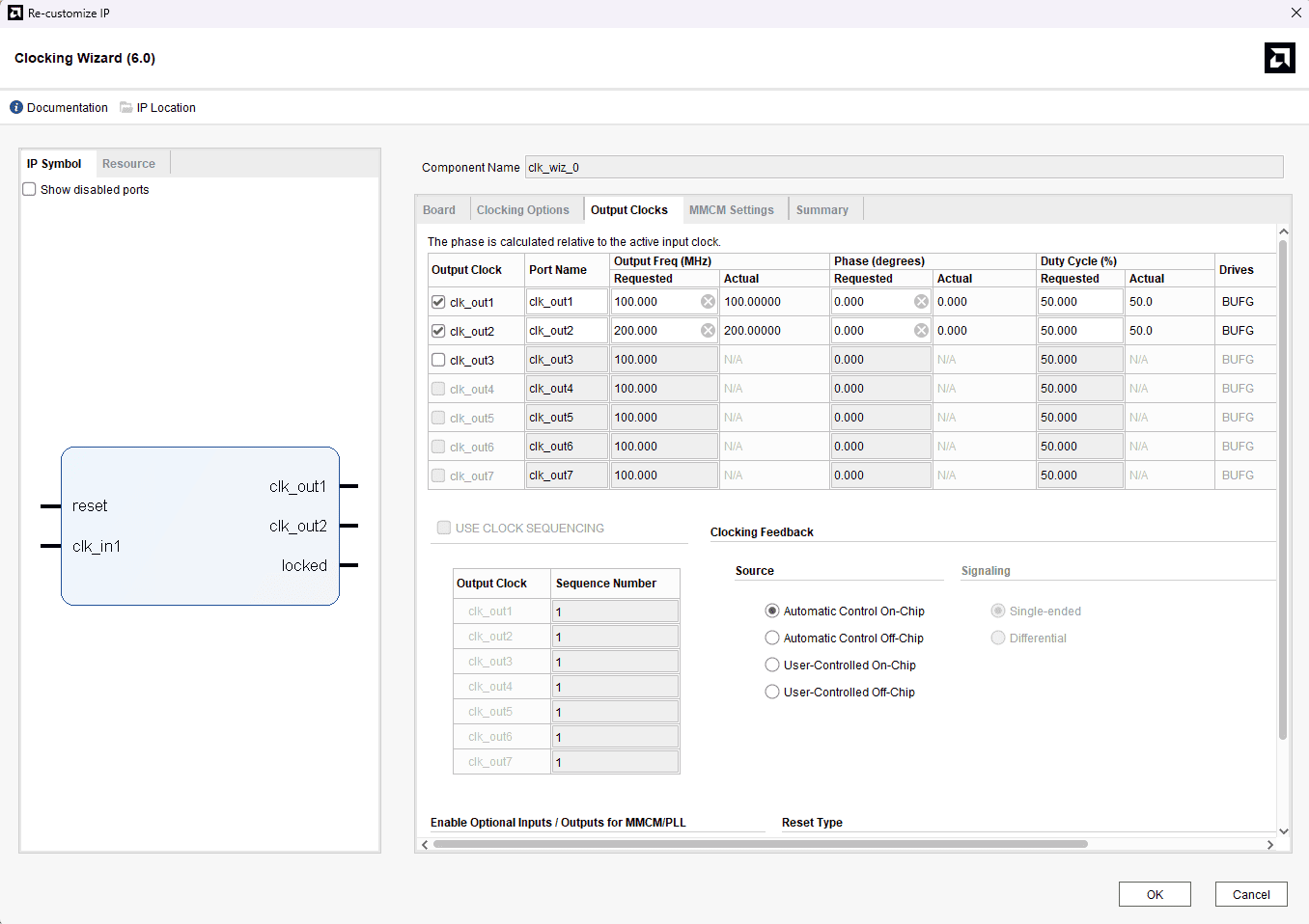 Double click “Clocking Wizard” IP and customize “Output Clocks” settings as shown in the following image.