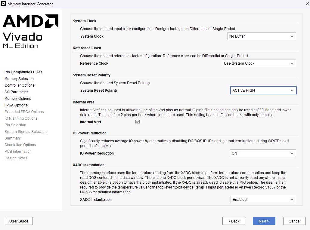 Double click on “mig_7series_0” to Re-customizing IP. Click “next” until we reach “FPGA Options“, change the “System Reset Polarity” to “Active High” and generate the IP.