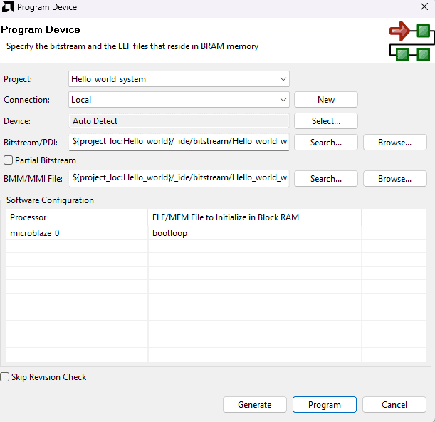 Program the FPGA on Mimas A7 Mini with a simple boot loop program by selecting the “Program Device” option from the “Vitis” menu