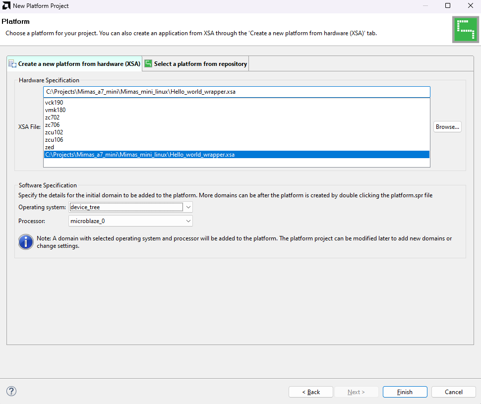 In the “Platform” window, select “Create a new platform from hardware” tab and import the “XSA file” which is already created (Provide XSA file location). Click “Next“.