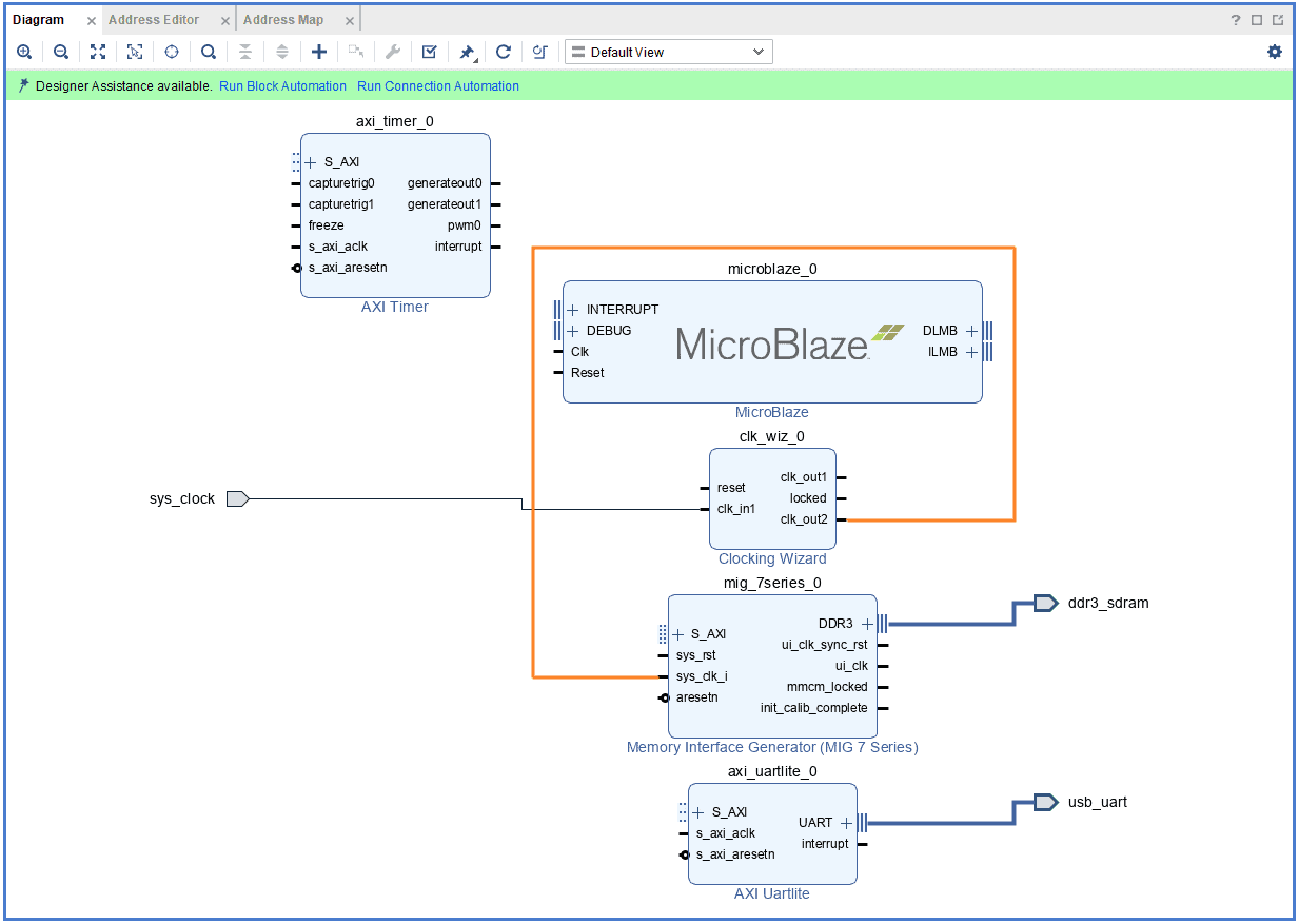 Click “Run Block Automation” present in the “Designer Assistance available” bar on the top left corner of the window to complete the design. Select the settings as shown in the following image. Click “OK” for Vivado to automatically configure the blocks for you. Once Block Automation is complete, run “Connection Automation” so Vivado can connect the blocks to make a complete system.