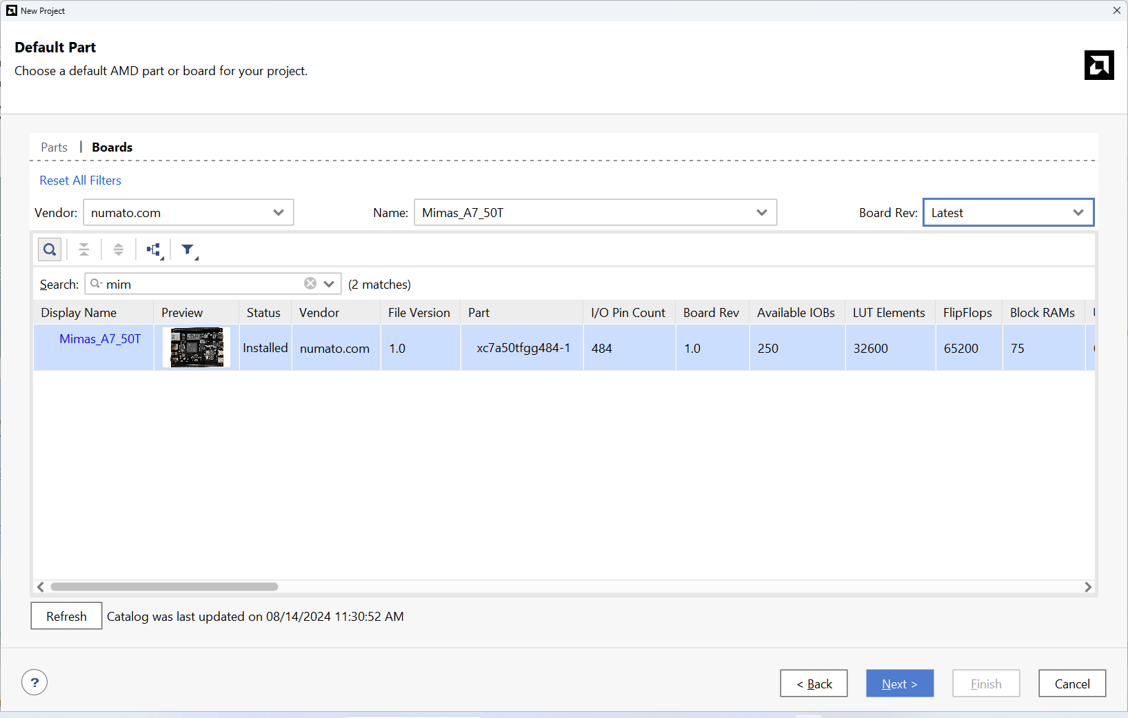 In the Default Part window, select “Mimas_A7_50T” from the Boards option. If Mimas_A7_50T is not listed, make sure board support files are installed correctly. Click Next to continue.