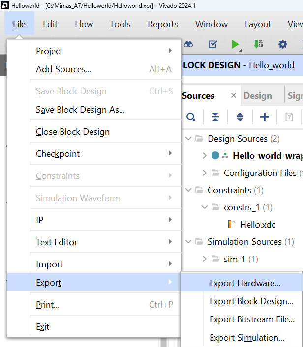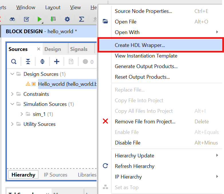 Right-click “Hello_world” in the “Sources” window, and select “Create HDL Wrapper” from the popup menu. Click “OK” on the window that appears to finish generating a wrapper.