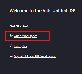 After Vitis Unified IDE window opens, click on “Open Workspace” and select necessary folder to keep the Vitis files.