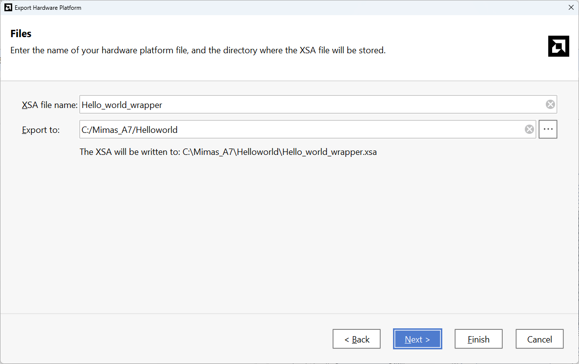 Provide the XSA file name and save it at a suitable location. Click Next and click Finish in the next dialog box.