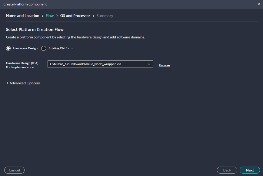 Create a new platform for the project, by selecting “Create Platform Component”, click “Next”, in the Flow tab select the XSA file saved using the step 15 and finally click “Next” and “Finish” respectively.