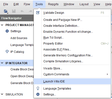 Select Launch Vitis IDE from the Tools menu. Provide a Workspace directory and click Launch.