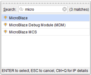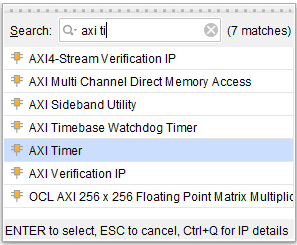 Add System Clock, DDR3 SDRAM and USB UART to the design by double-clicking the corresponding peripherals. In the Diagram window, right-click and select “Add IP” from the popup menu. Search for “MicroBlaze” & “AXI Timer” and add them to the design by double-clicking them.