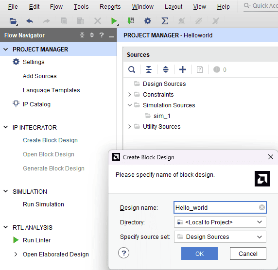 In the Flow Navigator panel, select Create Block Design under IP INTEGRATOR. Enter a name for the block design and click OK. An empty block design will be created.
