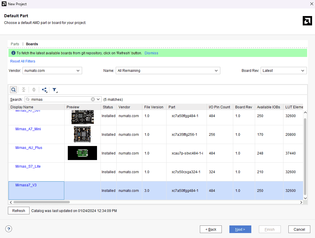 In the Default Part window, select “Mimas_A7_50T” from the Boards option. If Mimas_A7_50T is not listed, make sure board support files are installed correctly. Click Next to continue.